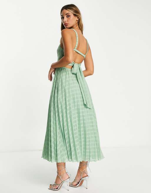 ASOS DESIGN elasticated tie back pleated midi dress in sage green