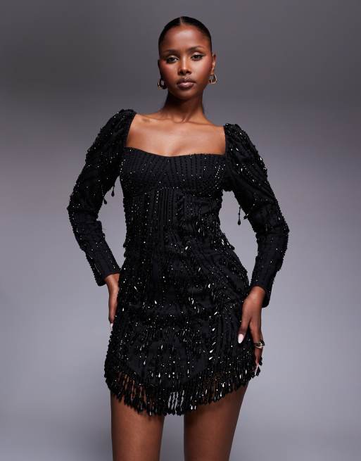 ASOS DESIGN embellished panelled mini dress with beaded fringe in black