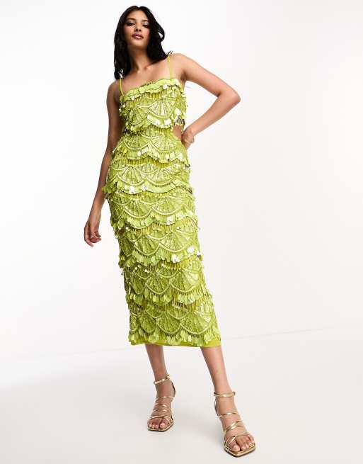 ASOS DESIGN embellished teardrop sequin midi dress with cut out waist detail in lime