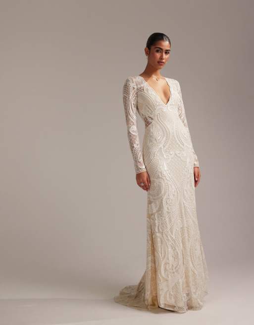 ASOS DESIGN embroidered plunge long sleeve maxi wedding dress in ivory