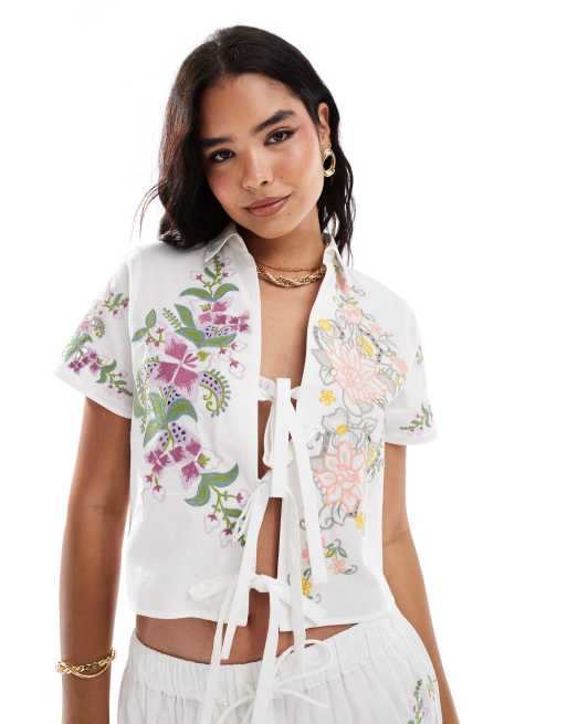 ASOS DESIGN embroidered tie front floral shirt co-ord in white