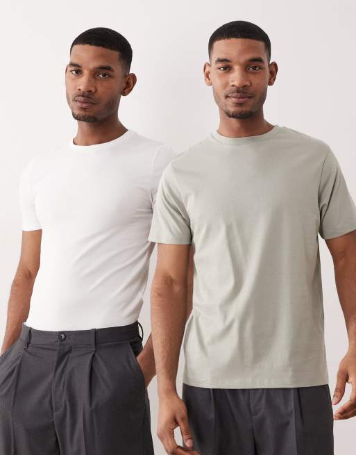 ASOS DESIGN Essentials 2 pack muscle fit t-shirts in white and khaki