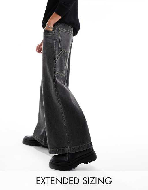 ASOS DESIGN extreme wide leg jeans with contrast green stitch in washed black