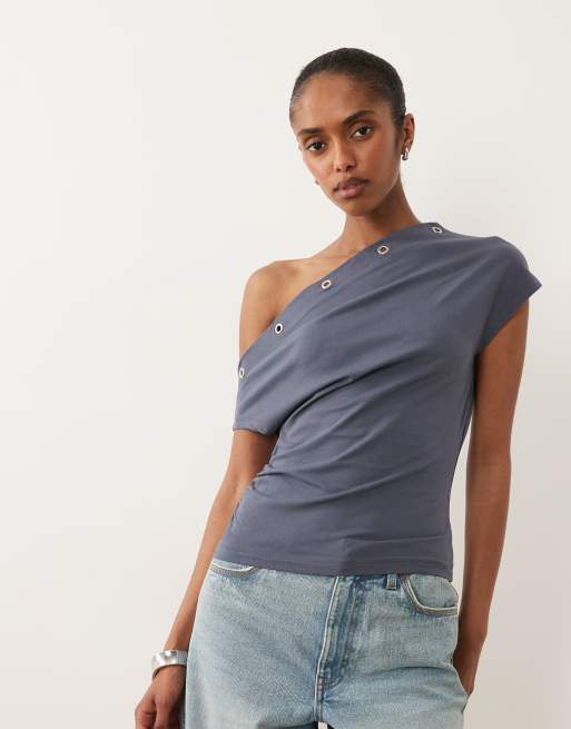 ASOS DESIGN eyelet detail off the shoulder top in washed in navy