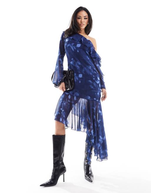 ASOS DESIGN fallen shoulder chiffon midi dress with asymmetric hem and tendril detail in blurred floral print