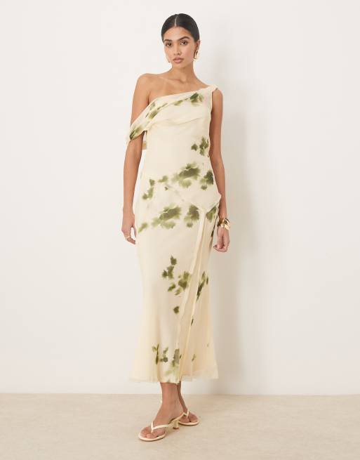 ASOS DESIGN fallen shoulder twist cowl neck seam detail midi dress in cream and green blur print