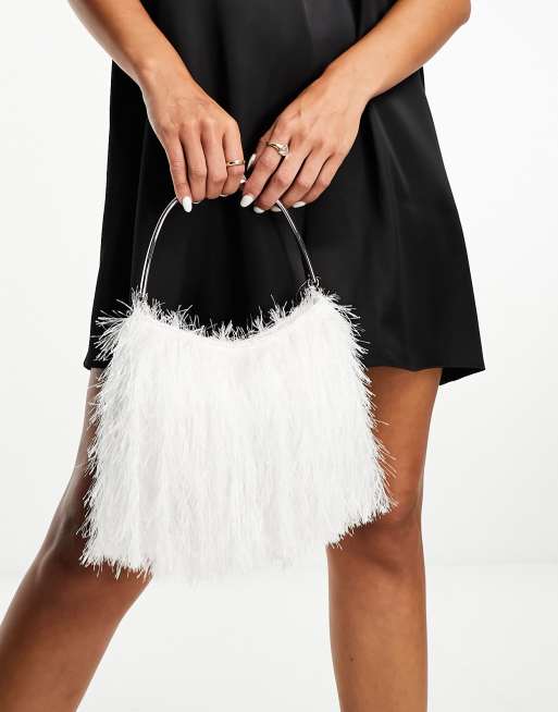 ASOS DESIGN faux feather clutch bag with silver handle in white