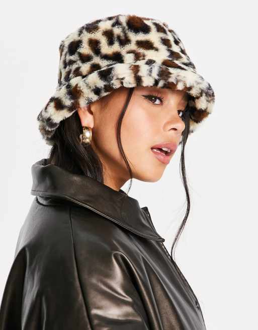 ASOS DESIGN faux fur roll back bucket hat in leopard print