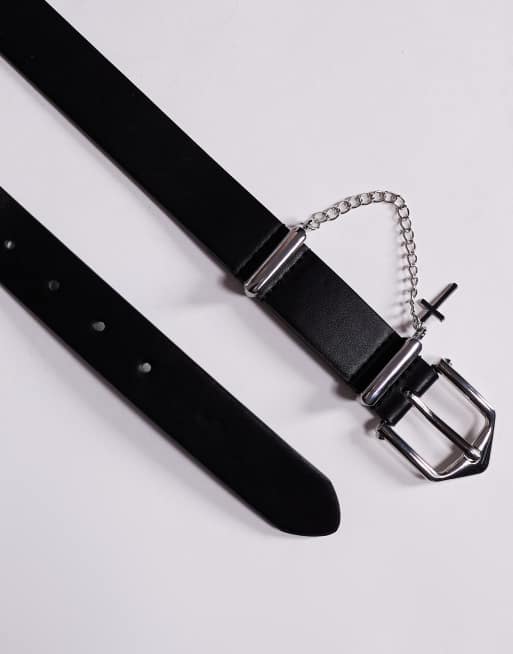 ASOS DESIGN faux leather belt with cross and chain attachment in black
