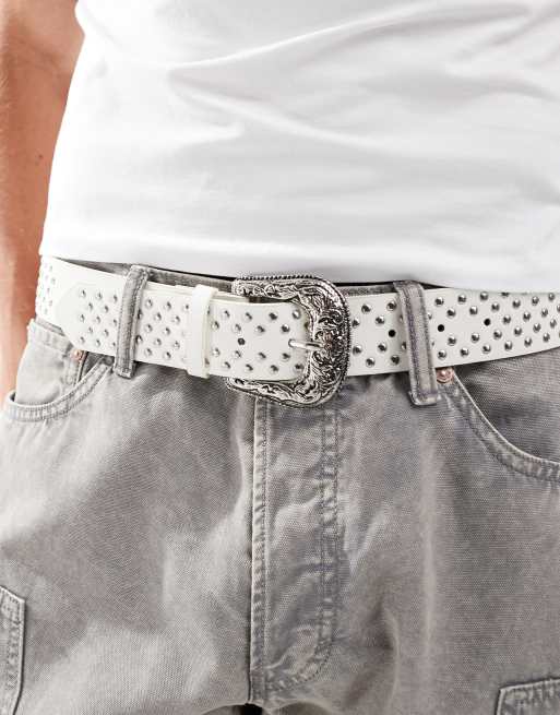 ASOS DESIGN faux leather belt with western buckle and studs in white