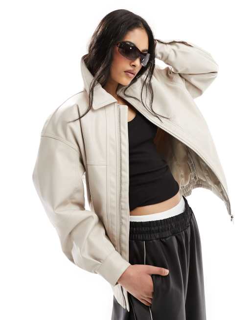 ASOS DESIGN faux leather bomber jacket with collar in putty