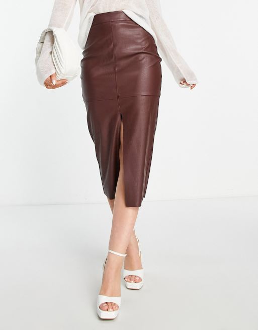 ASOS DESIGN faux leather croc midi skirt in chocolate