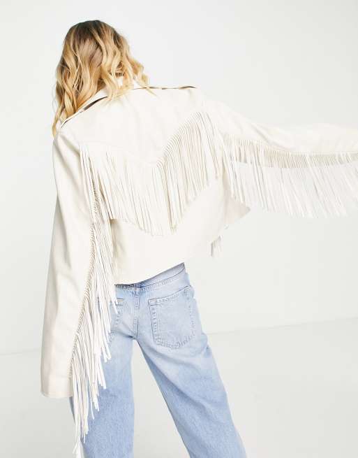 ASOS DESIGN faux leather fringed biker jacket in white