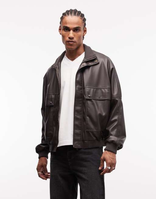 ASOS DESIGN faux leather funnel neck jacket in brown