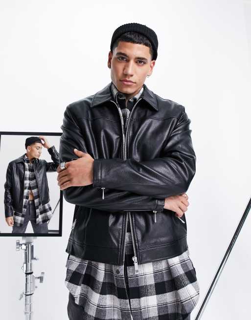 ASOS DESIGN faux leather harrington jacket in black with borg lining