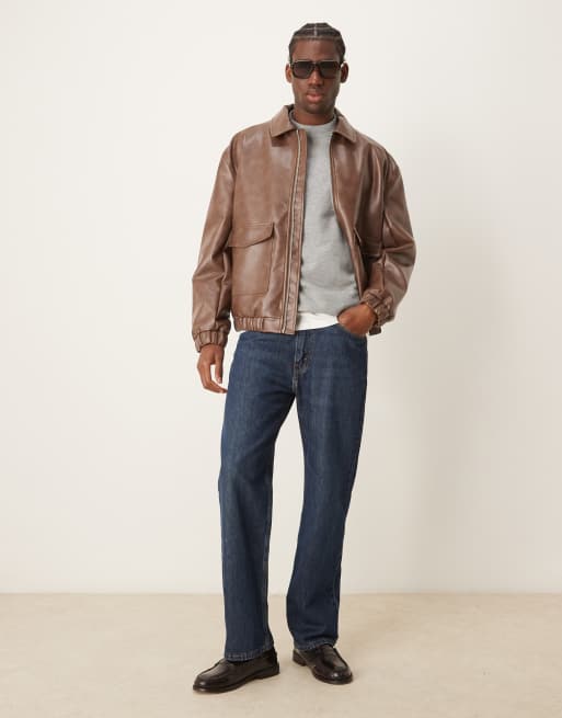 ASOS DESIGN faux leather harrington jacket in distressed brown - BROWN