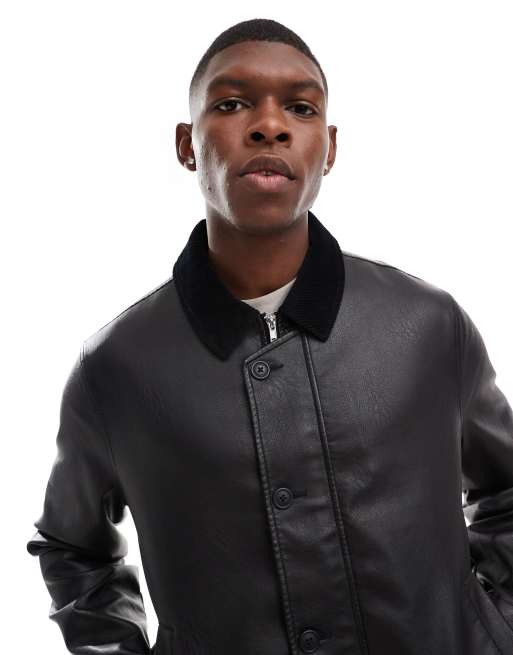 ASOS DESIGN faux leather harrington jacket with cord collar in black