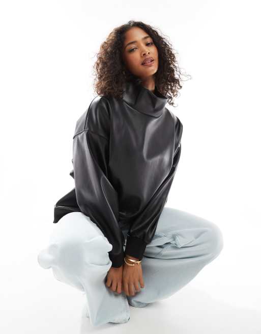 ASOS DESIGN faux leather high neck sweatshirt in black pu