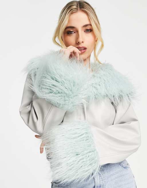 ASOS DESIGN faux leather jacket with borg trim in blue