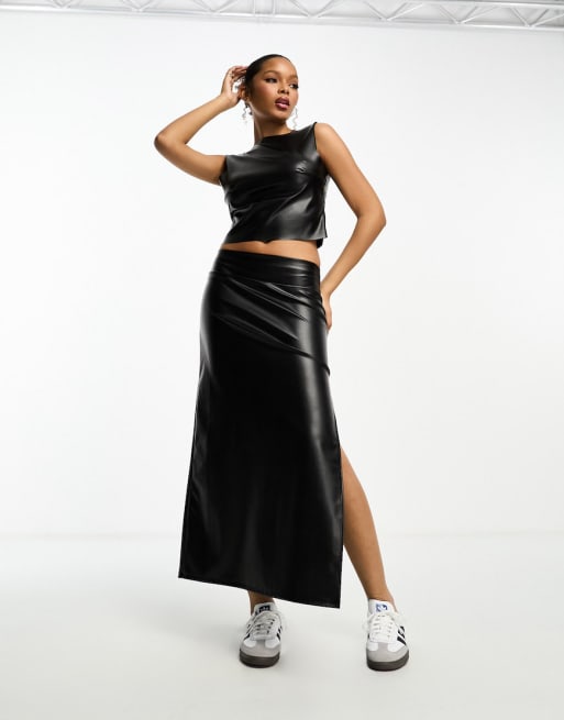 ASOS DESIGN faux leather low back top and maxi skirt co ord in black