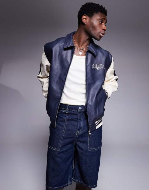 ASOS DESIGN faux leather oversized motocross jacket in navy with contrast sleeves