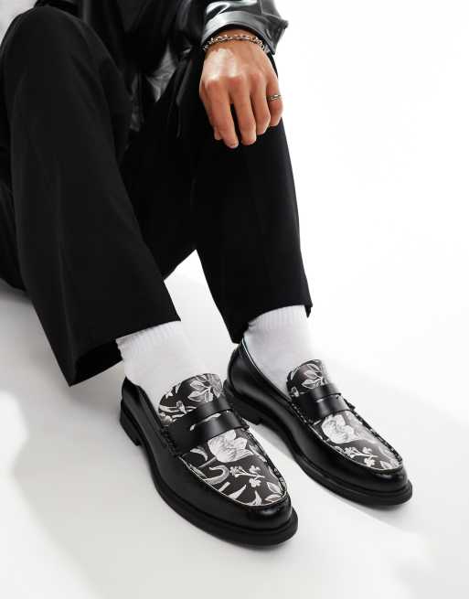 ASOS DESIGN faux leather penny loafers in black with floral print