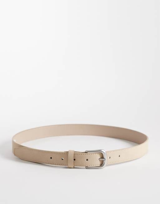 ASOS DESIGN faux suede smart single stud belt with rounded edge brushed silver buckle in stone