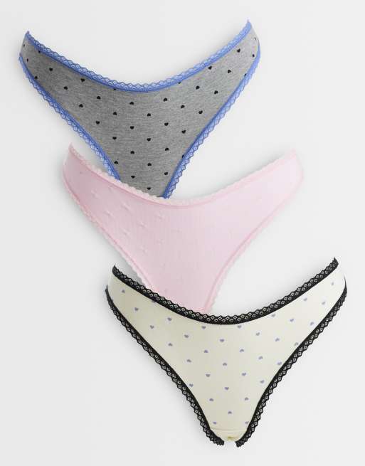 ASOS DESIGN Faye 3 pack heart print thong with lace trim in grey, blue & pink