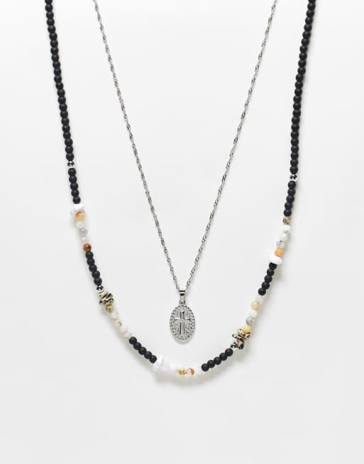 ASOS DESIGN festival semi-precious 2 pack beaded and cross coin pendant in silver and black