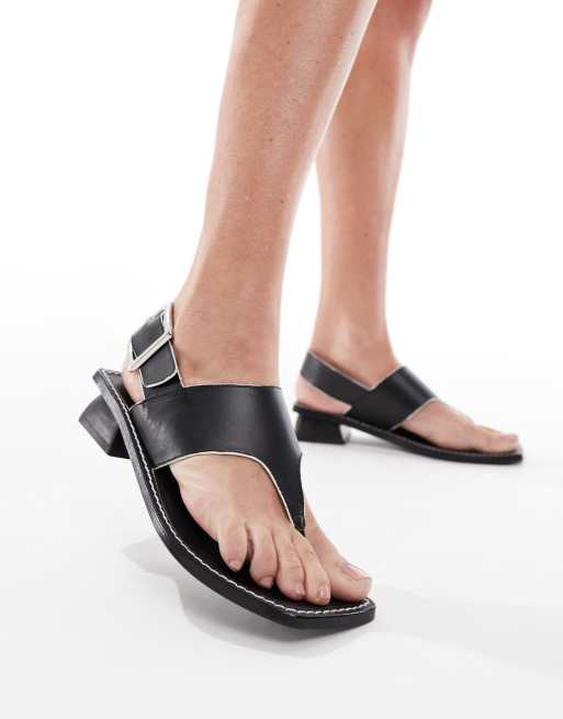 ASOS DESIGN Film leather heeled toe thong sandal in black