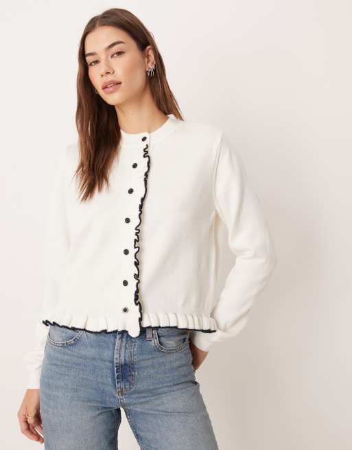 ASOS DESIGN fine knit frill detail cardigan with contrast tipping in cream