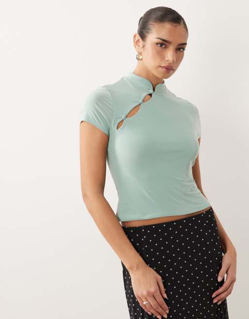 ASOS DESIGN fitted short sleeve top with rouleau loop buttons detail in blue