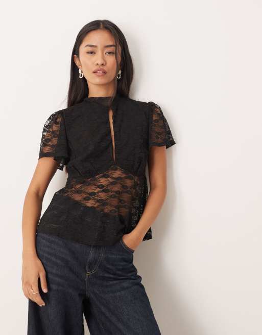 ASOS DESIGN floaty lace flutter sleeve button top with tie neck detail in black