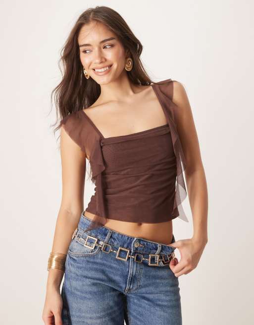 ASOS DESIGN floaty mesh cami top with ruching in chocolate