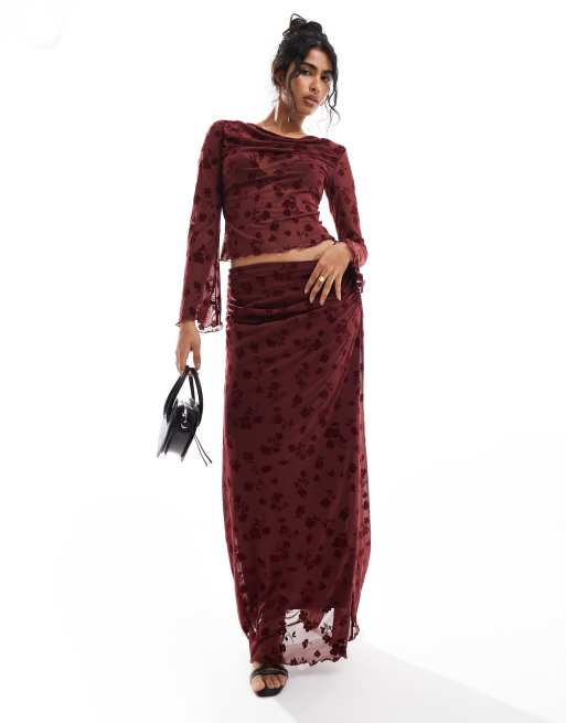 ASOS DESIGN flock floral flared sleeve top and skirt co ord in burgundy