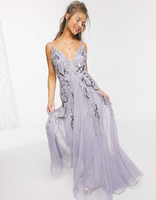 ASOS DESIGN floral embellished mesh godet maxi dress in lilac