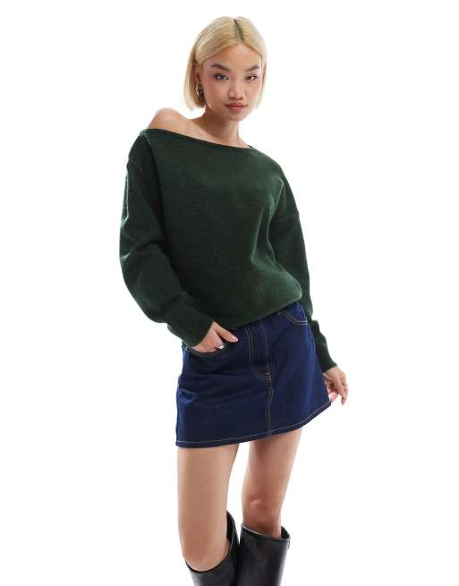 ASOS DESIGN fluffy one shoulder jumper in forest green