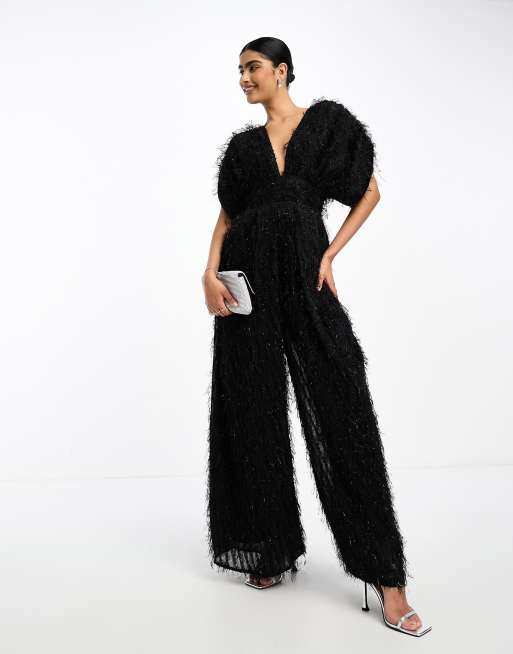 ASOS DESIGN fluffy plunge jumpsuit in black