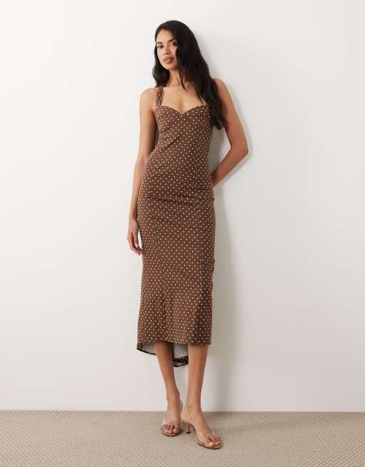 ASOS DESIGN flute hem halter dress in brown polka dot