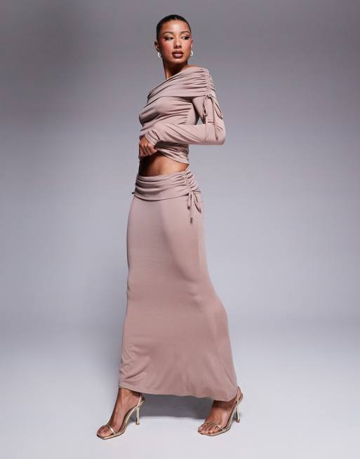 ASOS DESIGN fold over waist fishtail maxi skirt with side ruching in mink