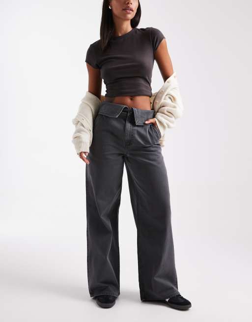 ASOS DESIGN fold over waist wide leg trousers in charcoal