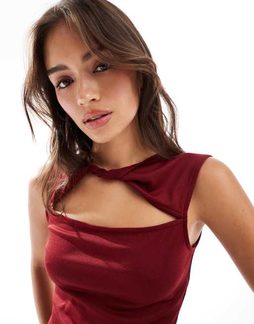 ASOS DESIGN gauzy twist front sleeveless tank with cut out detail in burgundy