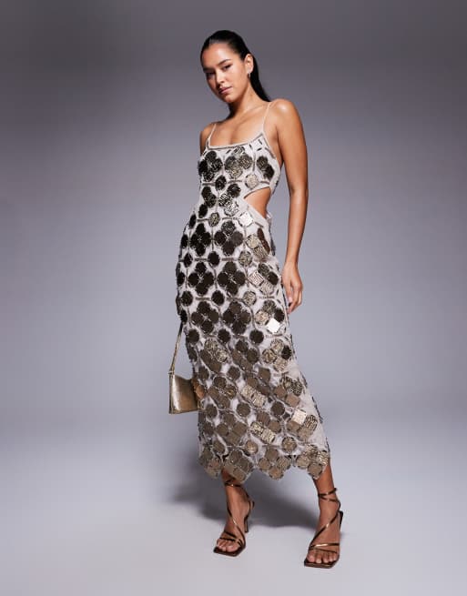 ASOS DESIGN grid embellished cutwork midi dress in gunmetal