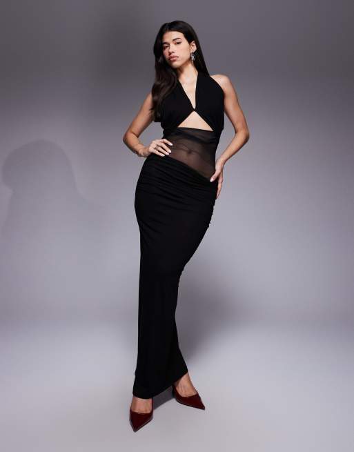 ASOS DESIGN halter maxi dress with mesh panel in black