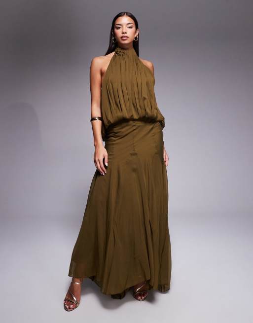 ASOS DESIGN halter neck slouchy dropped waist godet maxi dress in khaki