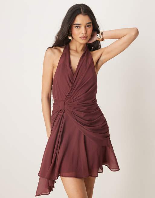 ASOS DESIGN halter plunge mini dress with drape detail in chocolate brown