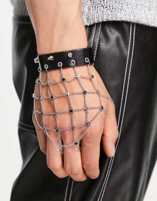 ASOS DESIGN hand harness with chain detail and spikes in black faux leather