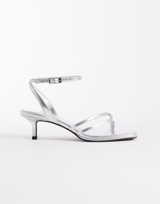 ASOS DESIGN Harbour minimal strappy toe thong kitten heel sandals in silver