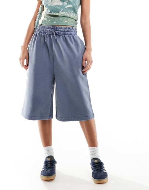 ASOS DESIGN heavyweight longline sweat shorts in washed indigo blue