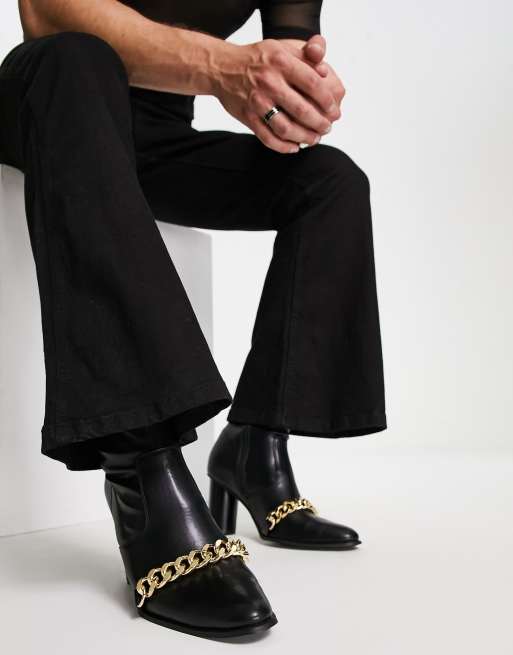 ASOS DESIGN heeled boots in black faux leather with gold chain detail